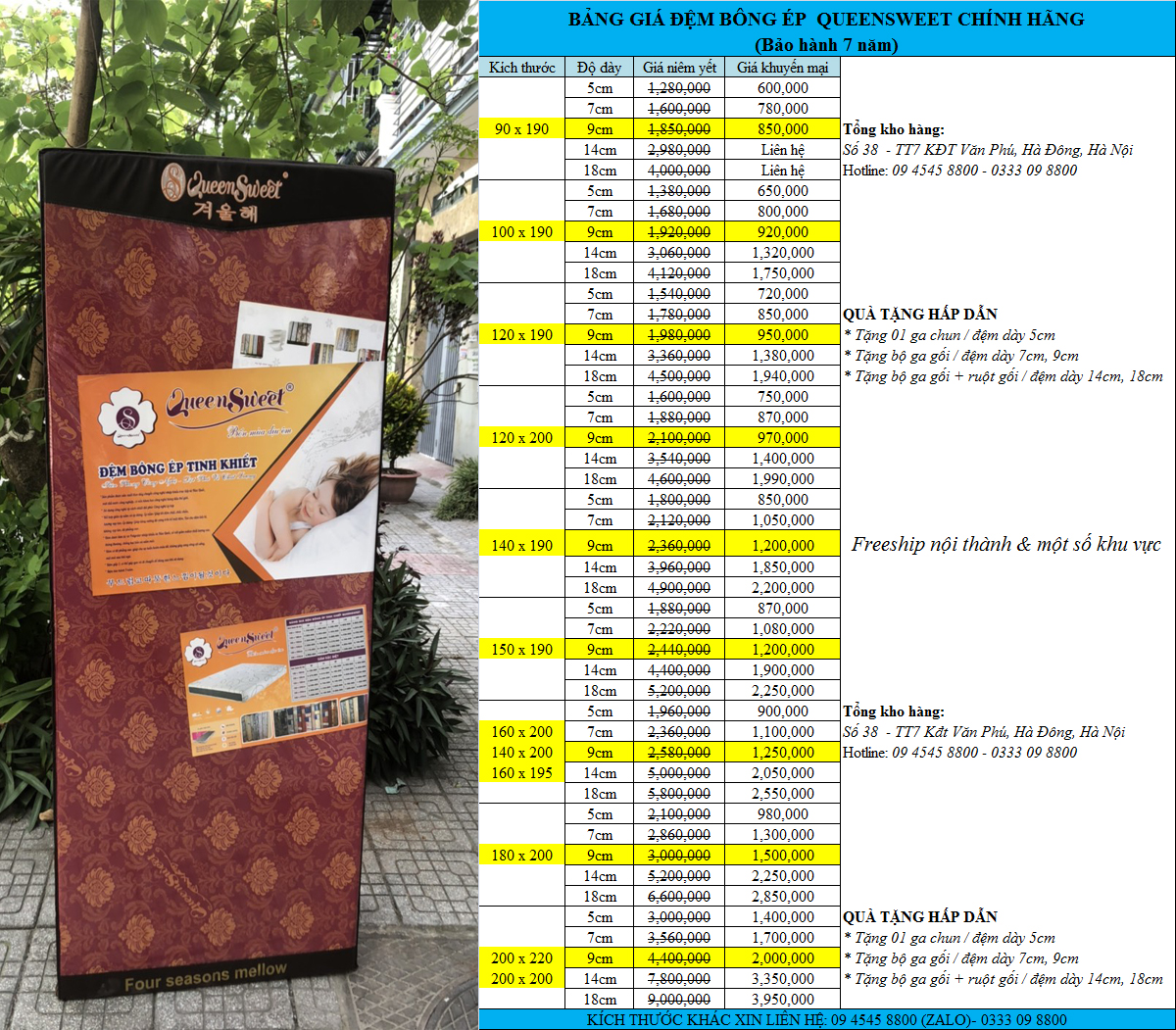 Là dòng đệm vừa tiền nhưng chất lượng không kém gì hàng hãng với lõi bông làm từ bông trắng tinh khiết, được ép chặt thành từng khối chắc chắn, độ đàn hồi ít thích hợp cho những ai thích nằm cứng nhiều. Vỏ đệm làm từ chất liệu valize với 3 màu đẹp là vàng - xanh - đỏ. Đệm bông ép Queensweet được bảo hành lên tới 7 năm về vấn đề lún xẹp, tuổi thọ sử dụng có thể lên tới 15 năm