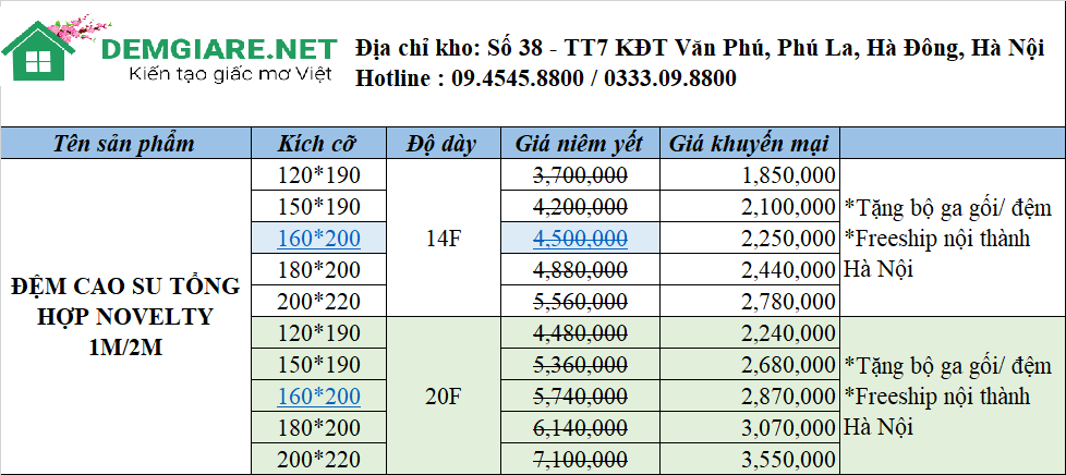 – Đệm cao su non tổng hợp Novelty của thương hiệu Tuấn Anh được sản xuất với đầy đủ các kích thước tiêu chuẩn bao gồm: 100*190cm, 120*190cm, 150*190cm, 160*200cm, 180*200cm, 200*220cm và độ dày cơ bản 14cm phù hợp với nhiều không gian sống của các gia đình khác nhau. Bên cạnh đó, Demgiare.net cũng hỗ trợ khách hàng sử dụng giường nhỡ cỡ đặt đệm theo yêu cầu đối với dòng đệm này chỉ sau khoảng 3 – 5 ngày có thể nhận được hàng tại nhà.